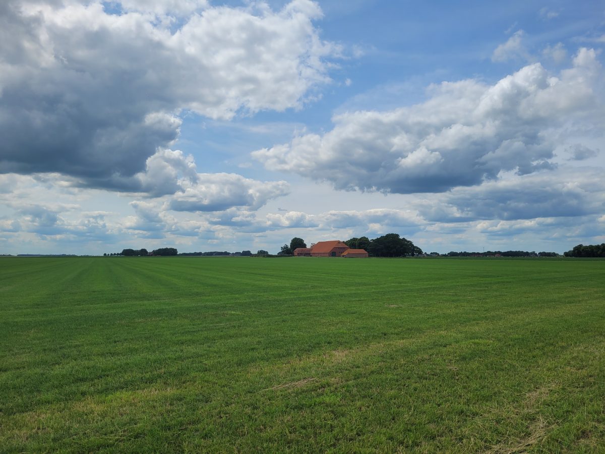 We lopen Drieborg in, een klein, slaperig dorpje. Rechts staat een boerderij met een oude schuur, de bakstenen ervan lijken als Jenga-blokjes op elkaar te liggen. ‘Hier moeten we rechtsaf’, wijst Hemel als we het dorp weer uit zijn, op de plek waar een kaarsrechte sloot de weg kruist. ‘Ja, door het land’, voegt hij eraan toe. We stappen het weiland in en lopen parallel aan de sloot oostwaarts over een pad dat bedekt is met stro.
