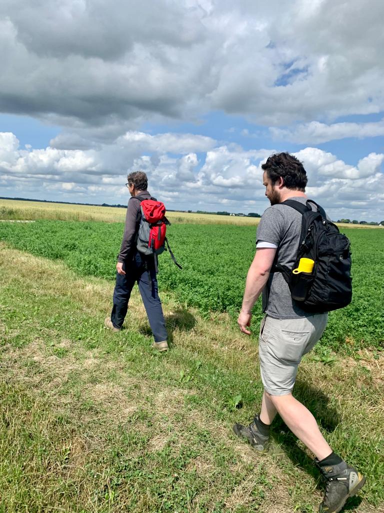 Zwijgend sjokken we een stukje door. Je hoort hier niks, alleen zo nu en dan een vogel en heel ver weg wat verkeer. Over de toppen van de ongeveer een meter hoge aren zien we de oranje daken en muren van een fraaie vroeg-naoorlogse boerderij. De kleur steekt scherp af tegen de geelgroene graanvelden en het blauw van de lucht.